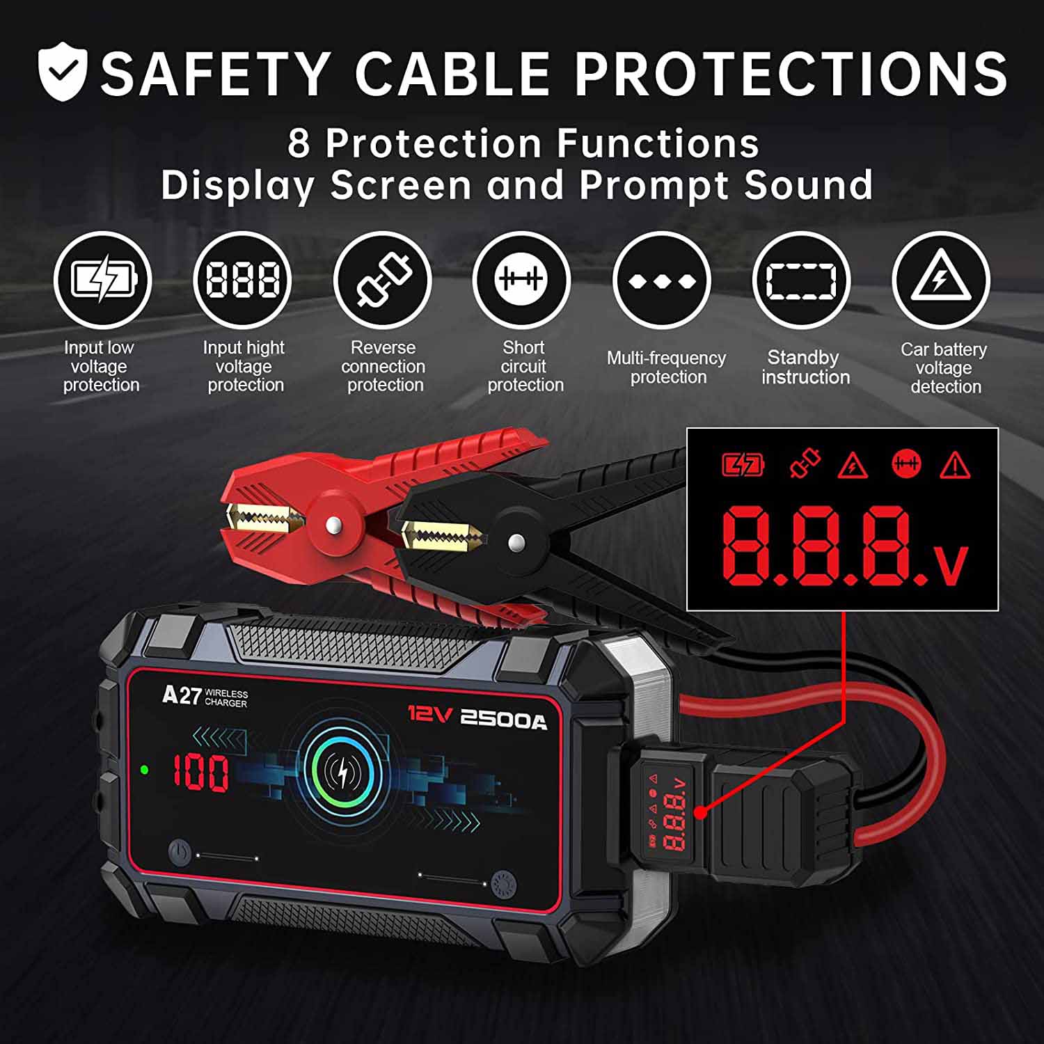 This portable jump starter works with intelligent heavy-duty copper clamps which provide 7 safety protections covering: reverse polarities, short circuits, over-currents, reverse charges, over discharges, over temperatures, and low temperatures to ensure safe and fast jump-starts during its use. The indicator lights notify you of incorrect use and improper connections, providing the extra safety you need.