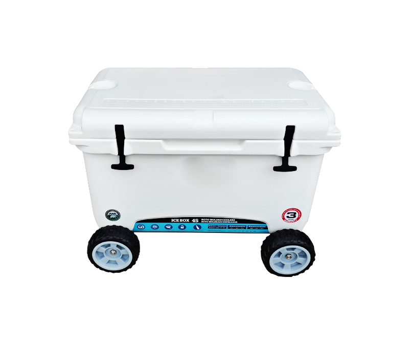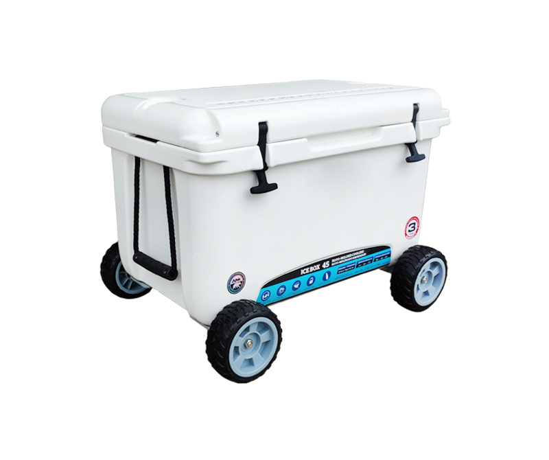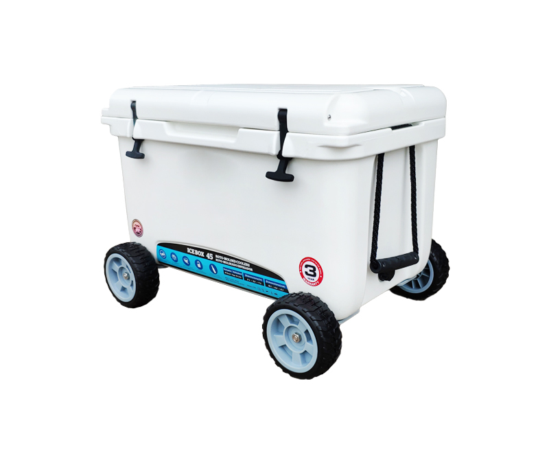 9. Install wheels and axles at the bottom of the cooler box with a proprietary fixator.